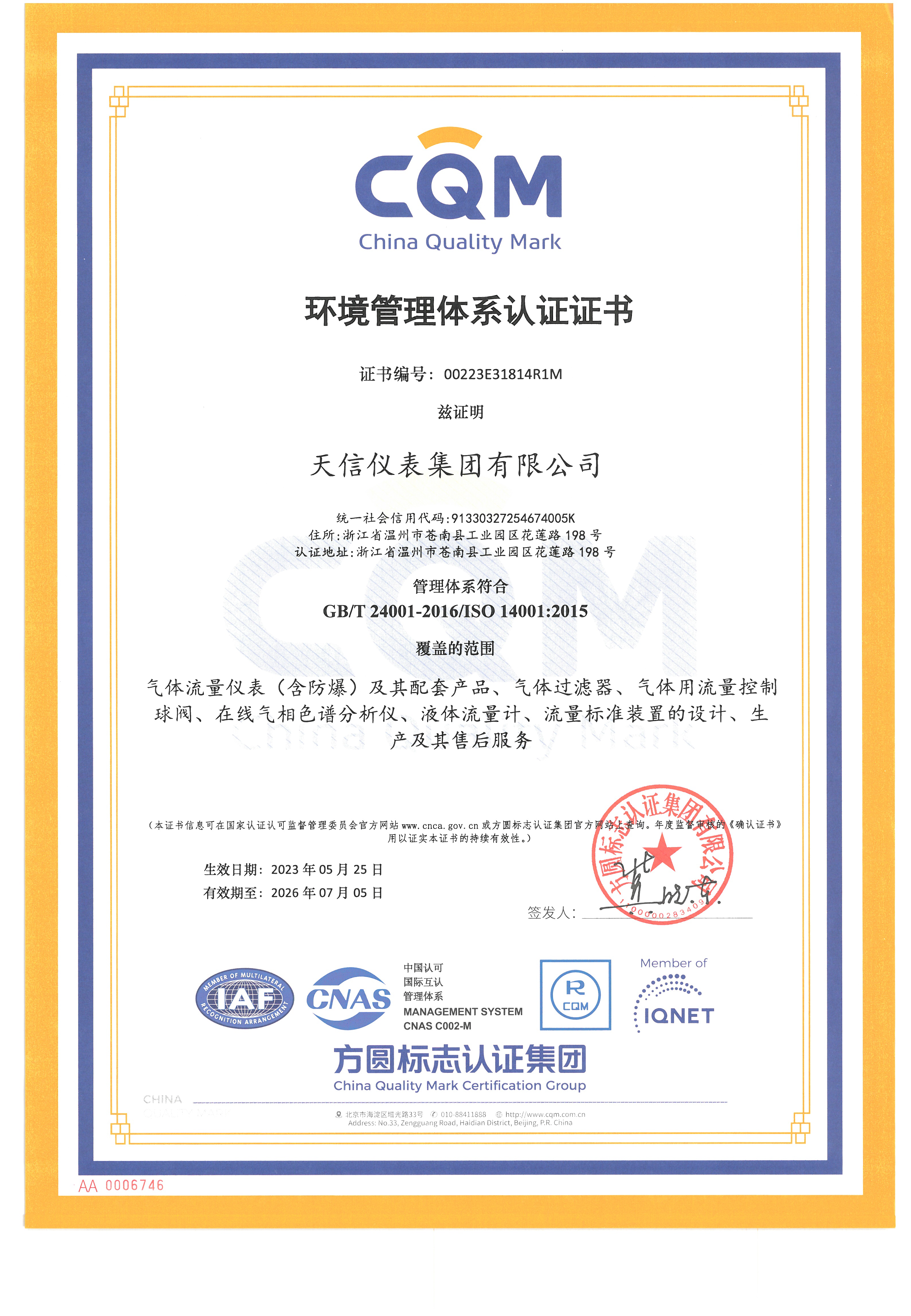 環境管理體系認證證書
