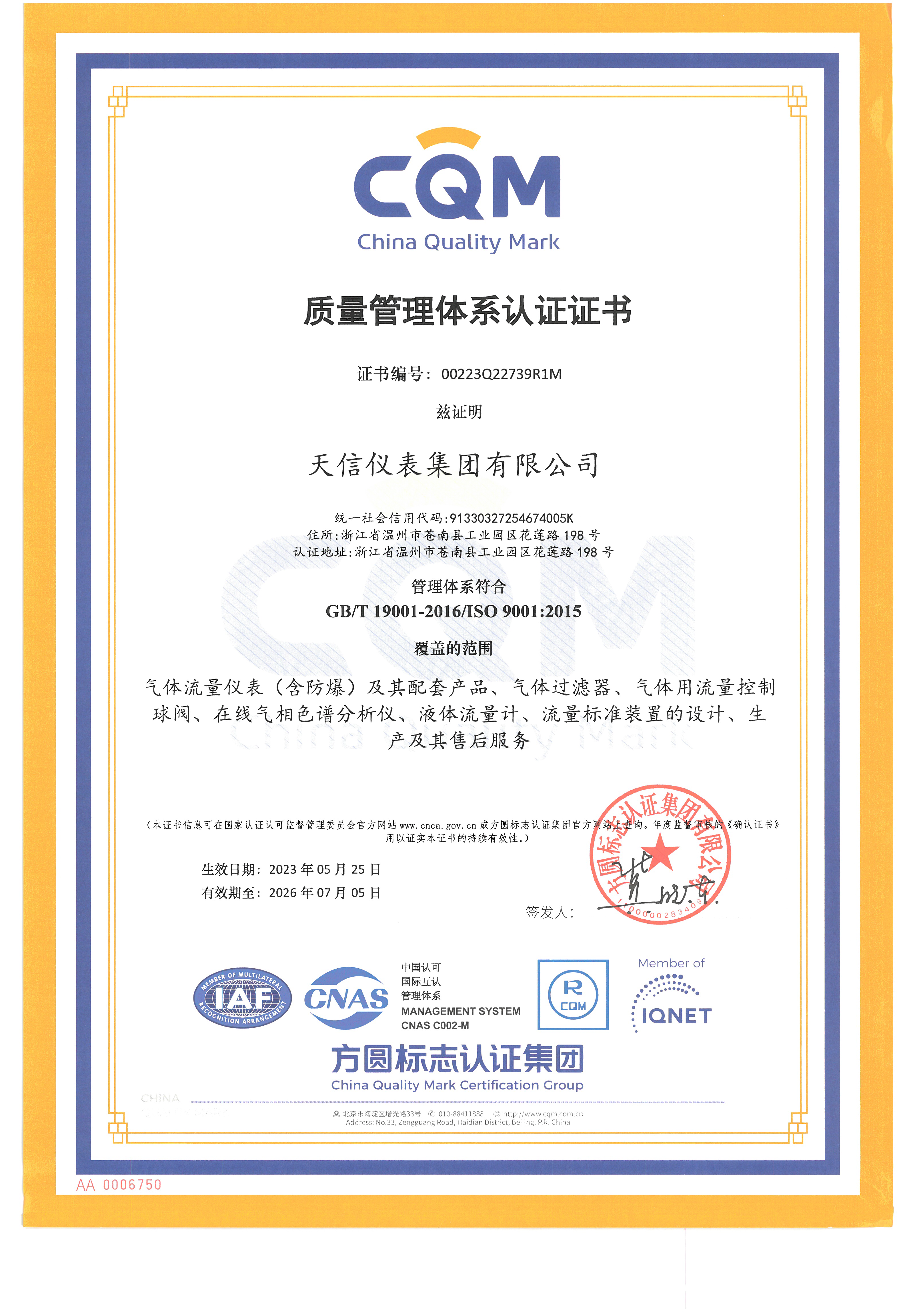 質量管理體系認證證書