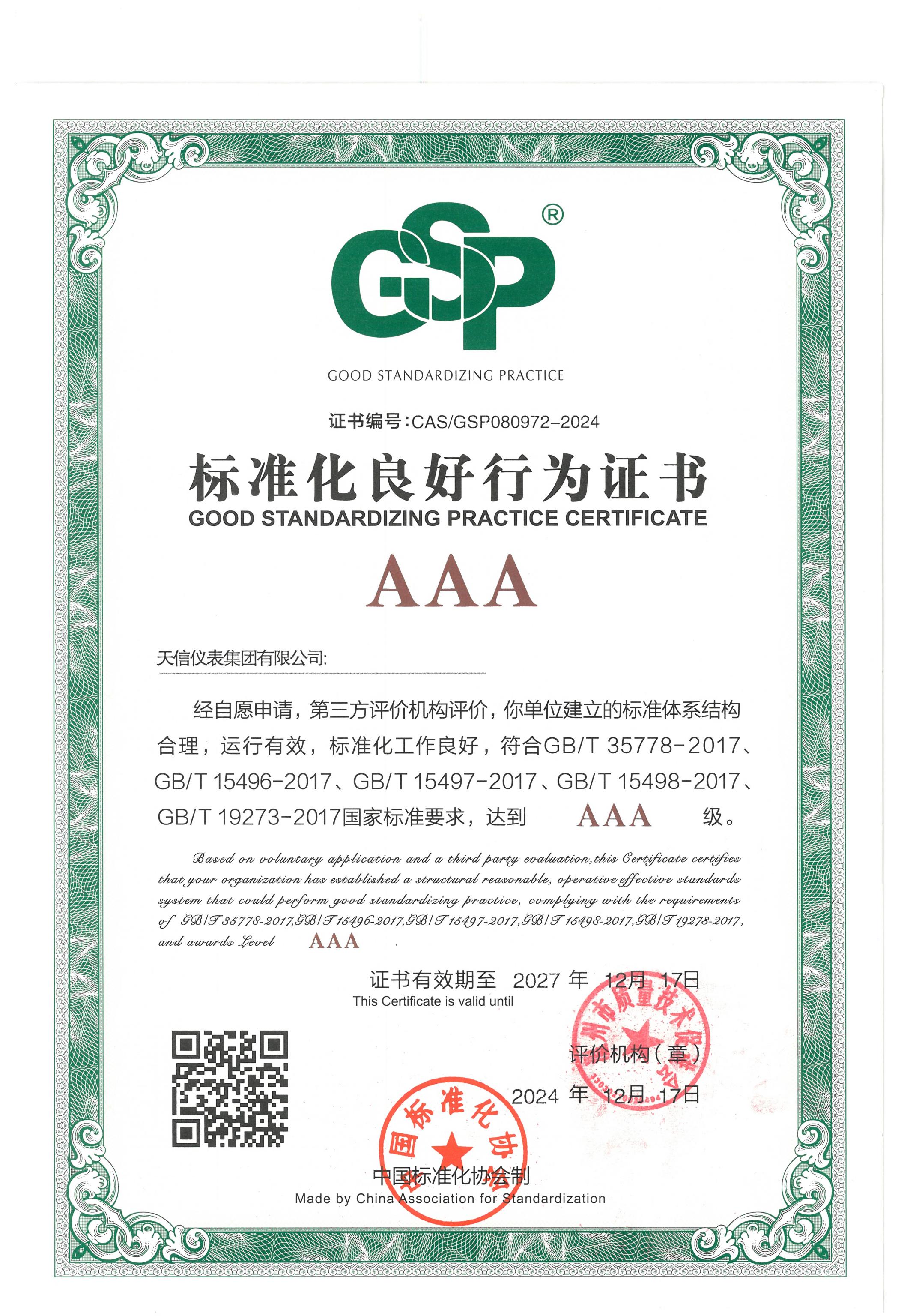 • 標準化良好行為證書