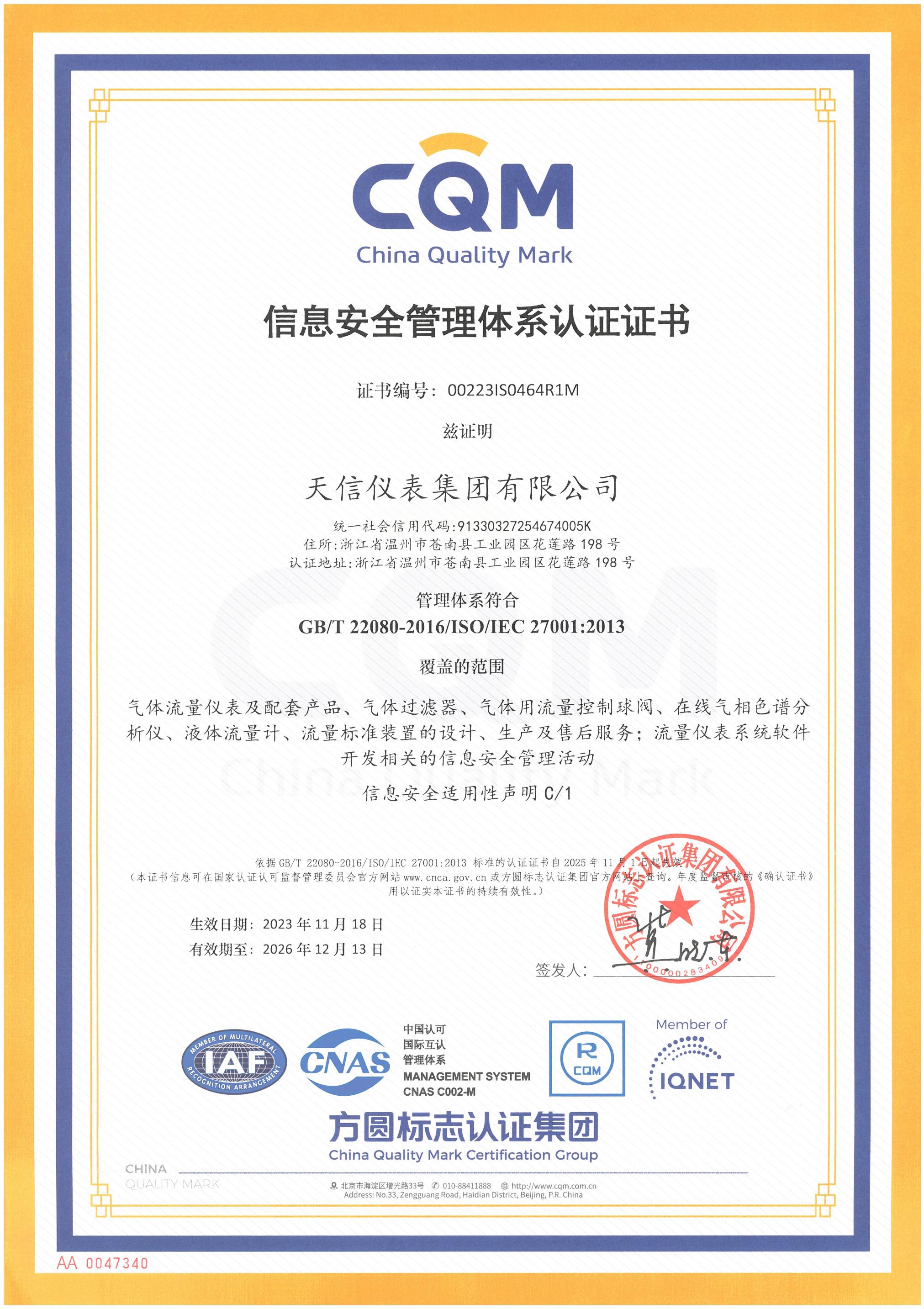 • 信息安全管理體系證書