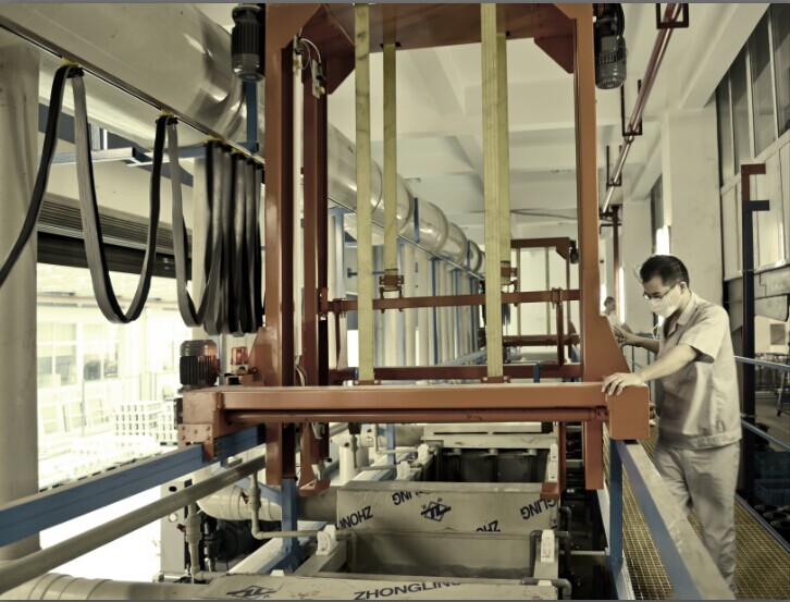 第一條生產(chǎn)線(xiàn)是2012年建成的,主要是對(duì)金工和腰輪的殼體、葉輪、機(jī)芯、轉(zhuǎn)子、端板、端蓋等關(guān)鍵零件進(jìn)行陽(yáng)極氧化處理。對(duì)不同材料的殼體及零部件進(jìn)行陽(yáng)極氧化處理時(shí),其電解液溫度、電壓和工序是不同的,工藝要求也不一樣,需要進(jìn)行分批處理。如:金工車(chē)間殼體進(jìn)行硬質(zhì)陽(yáng)極氧化時(shí),溶液內(nèi)溫度要調(diào)至6~9度;而腰輪車(chē)間G10~G400-4〞 殼體進(jìn)行硬質(zhì)陽(yáng)極氧化時(shí),溶液內(nèi)溫度是0度;另外,在進(jìn)行硬質(zhì)陽(yáng)極氧化之前還要放入酸洗槽,進(jìn)行化學(xué)拋光處理。這樣,不僅操作工序繁雜,而且時(shí)間上也比較漫長(zhǎng),效率不是很高。因此,現(xiàn)增設(shè)了第二條陽(yáng)極氧化生產(chǎn)線(xiàn),運(yùn)行后,可以?xún)蛇呁瑫r(shí)進(jìn)行陽(yáng)極氧化處理,工作效率得到了明顯的提高。